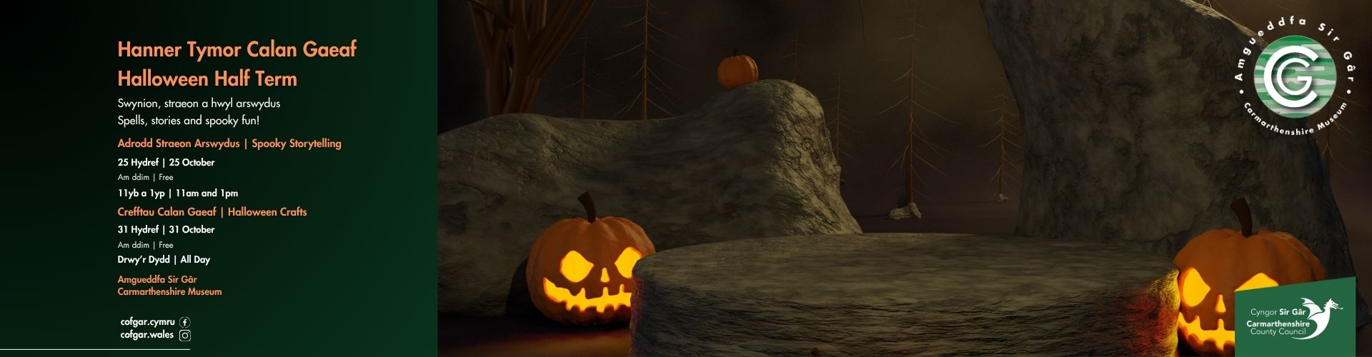 Mwynhewch adrodd straeon arswydus am ddim yn Amgueddfa Sir Gâr yr hanner tymor hwn. Clywch straeon ysbryd a llên gwerin Cymru mewn sesiynau sy'n addas i deuluoedd ar 25 Hydref.